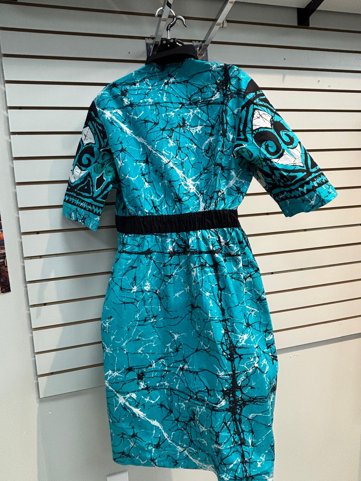 The gown features a high-impact Teal and Black abstract pattern, accented with intricate tribal motifs. The design is elevated by sophisticated solid black contrast details, including a crisp pointed collar, a central button placket, and a defined waistline. These black accents create a visual frame that slims the silhouette and adds a modern, professional edge to the vibrant print.